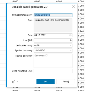 Pozycje analizy dodajemy do szczegółu za pomocą procedury Dodaj do tabeli generatora ZD dostępnej w głównym oknie słownika (dostępny jest też skrót klawiszowy <Ctrl+Shift+I>). Użytkownik wybiera komórkę na przecięciu wiersza kartoteki materiałowej oraz kolumny dnia zapotrzebowania i uruchamia powyższą procedurę.