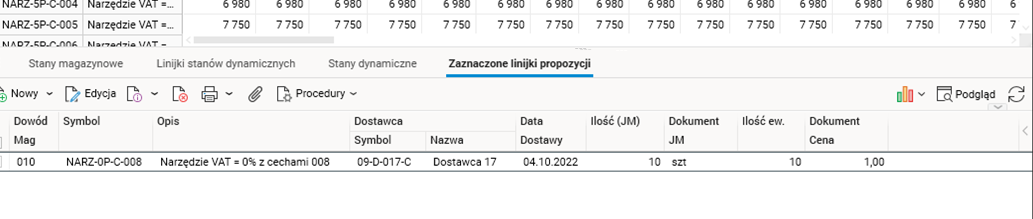 Po zatwierdzeniu danych przyciskiem OK wiersz z danymi pojawi się w szczególe Zaznaczone linijki propozycji. Szczegół jest edytowalny, dlatego operator może modyfikować dane, a także je usuwać.