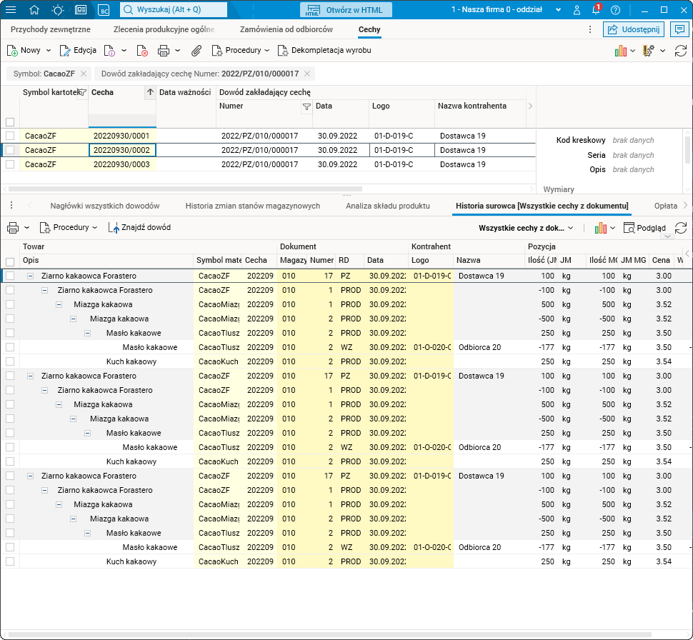 Na powyższym rysunku widać trzy partie przychodowe, które powstały dla surowca o symbolu kartoteki CacaoZF na jednym dokumencie przyjęcia 2022/PZ/010/000017. W szczególe Historia surowca w nowym przekroju widać historię (dokumenty przychodowe PZ i rozchodowe PROD, na których surowiec został zużyty) ich wszystkich, niezależnie od tego, która partia przychodowa jest wybrana w tabeli danych głównego słownika.