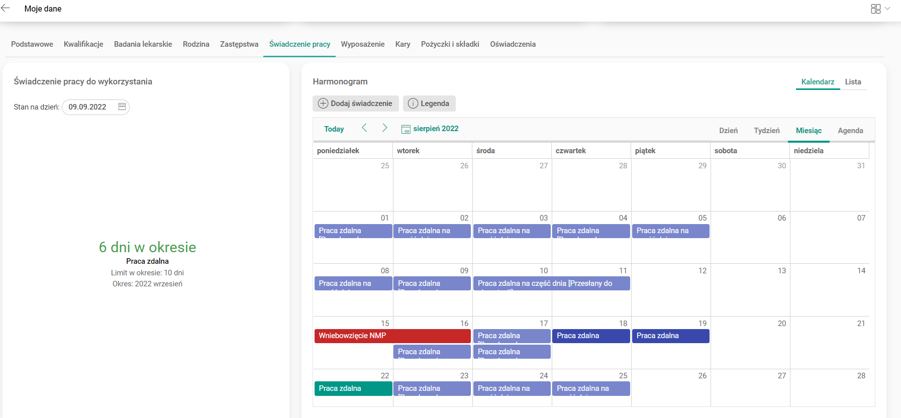 W portalu HR, na pulpicie Moje dane udostępniona została nowa zakładka Świadczenie pracy. Podzielona jest ona na dwie sekcje: Świadczenie pracy do wykorzystania oraz Harmonogram, w którym można ustawić widok kalendarza albo listy.