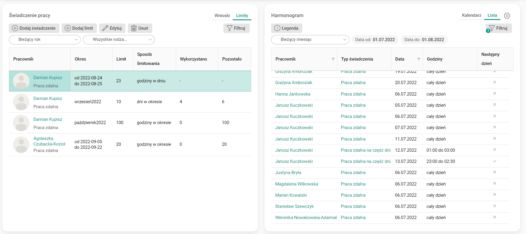 Rys. Pulpit Świadczenie pracy zespołu z widokiem Limity i widokiem Lista