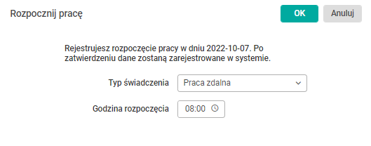 Aby zarejestrować rozpoczęcie pracy w danym dniu, należy użyć akcji Rozpocznij pracę. Pojawi się formularz, w którym wybieramy w polu Typ świadczenia jeden z dwóch wariantów, a w polu Godzina rozpoczęcia wybieramy lub wpisujemy czas rozpoczęcia pracy i zapisujemy akcją OK.