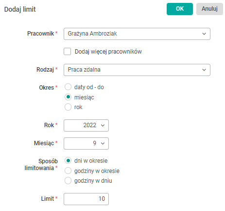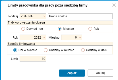 - Dodaj limit, która pozwala na wprowadzenie pracownikom limitu świadczenia pracy zdalnej.