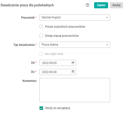 Pracownik ma możliwość planowania swojej pracy zdalnej za pomocą wniosku Świadczenie pracy. Wówczas w formularzu powinien wskazać zakres dat, na jakie ma być złożony wniosek, zapoznać się z treścią oświadczenia i zaakceptować je za pomocą pola wyboru Akceptuję powyższe oświadczenie. Następnie powinien zaznaczyć pole Wyślij do akceptacji (albo pominąć je, jeśli nie chce, aby wniosek został automatycznie przesłany do akceptacji przełożonego) i zapisać. Opcjonalnie można również dodać komentarz do wniosku.