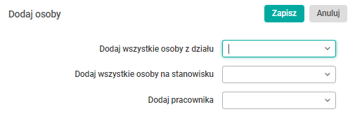 Przycisk Dodaj otwiera nowe okno, które pozwala na wprowadzenie wielu pracowników. Można dodać tu wszystkich pracowników z wybranego działu, zatrudnionych na wybranym stanowisku, albo poszczególnych pracowników ze swojego zespołu lub spoza niego.
