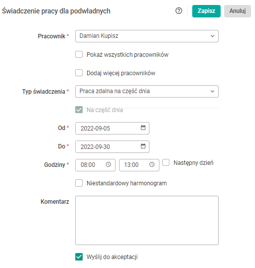 Rys. Formularz Świadczenie pracy dla podwładnych, typ Praca zdalna na część dnia