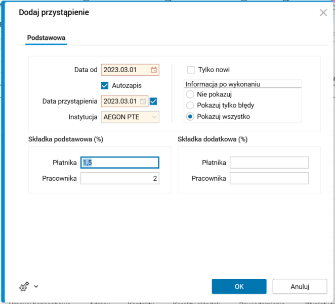 W parametrach dostępnej w kartotece PPK procedury Dodaj przystąpienie (umożliwiającej grupową rejestrację przystąpienia do PPK dla wybranych osób) dodano opcję Autozapis.