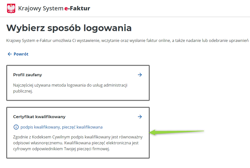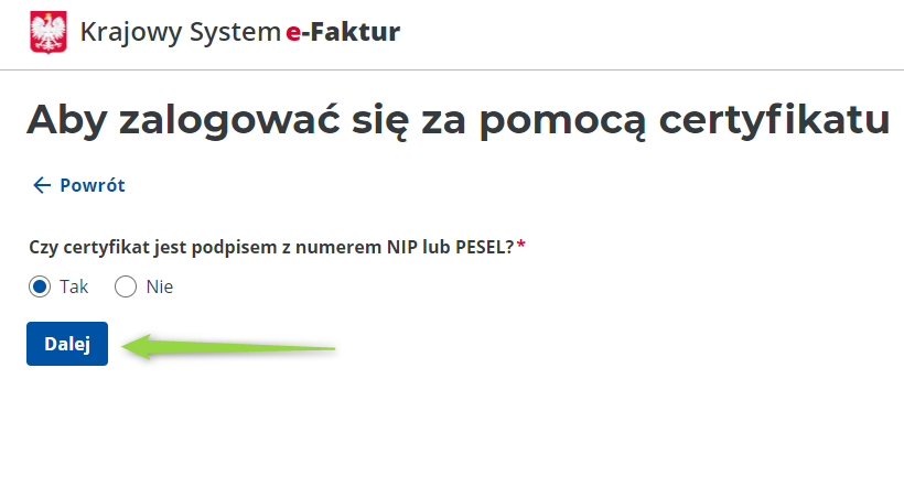 Rys. 3. Logowanie do portalu KSeF w wersji testowej za pomocą certyfikatu