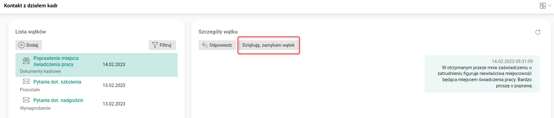 Pracownik, który wysłał wiadomość do działu kadr, widzi jej podgląd w sekcji Szczegóły wątku. Ma tam również dostęp do akcji Odpowiedz oraz Dziękuję, zamykam wątek (nowa).