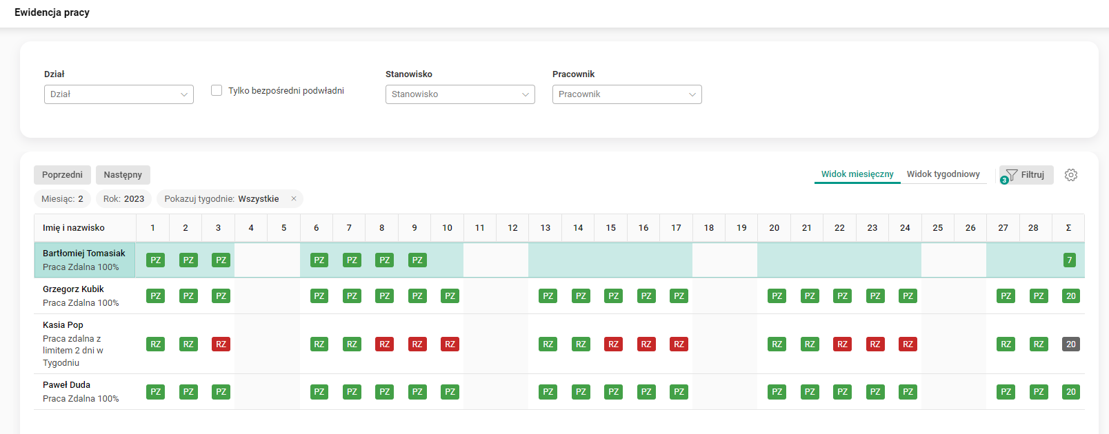 Nowy pulpit znajduje się w obszarze Mój Zespół. Rejestrowana przez podwładnych praca zdalna prezentowana jest na nim w widoku miesięcznym i tygodniowym.