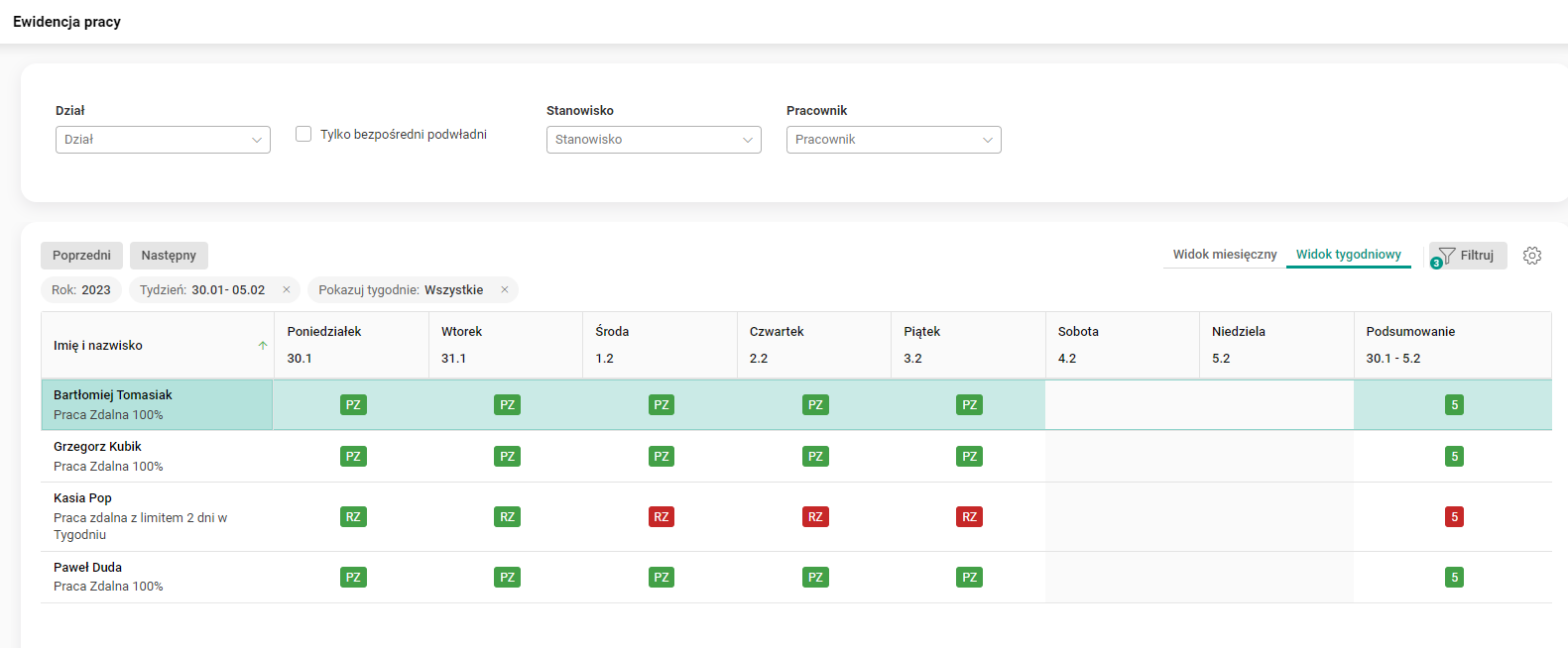 - Dział – ogranicza widok do osób pracujących w wybranym dziale,