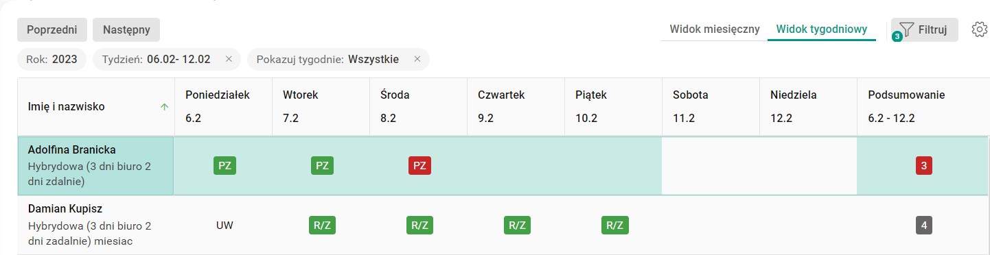 - Pokazuj tygodnie (wszystkie, poprawne, przekroczone) – wspólne dla obu widoków,