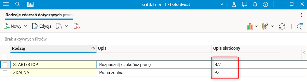 Sposób oznaczania pracy zdalnej na pulpicie Ewidencja pracy definiuje się w słowniku Rodzaje zdarzeń dotyczących pracy. Wartość wpisana w kolumnie Opis skrócony będzie wyświetlana w ewidencji w portalu HR.