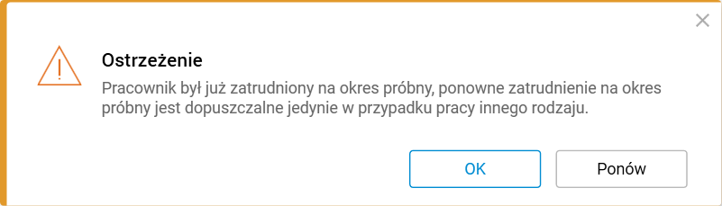 Podczas zawierania z pracownikiem kolejnej umowy o pracę na okres próbny pojawi się ostrzeżenie informujące, że taka umowa była już z danym pracownikiem zawarta.