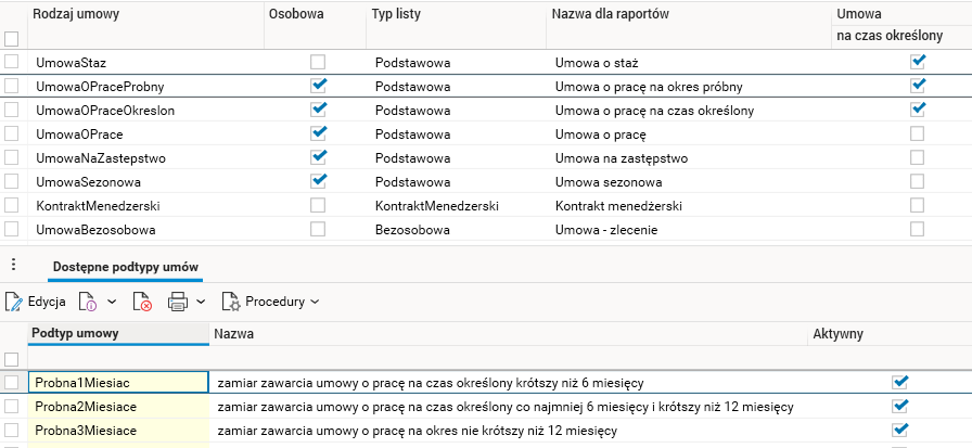 Dodane zostały nowe podtypy umów dla umowy na okres próbny.