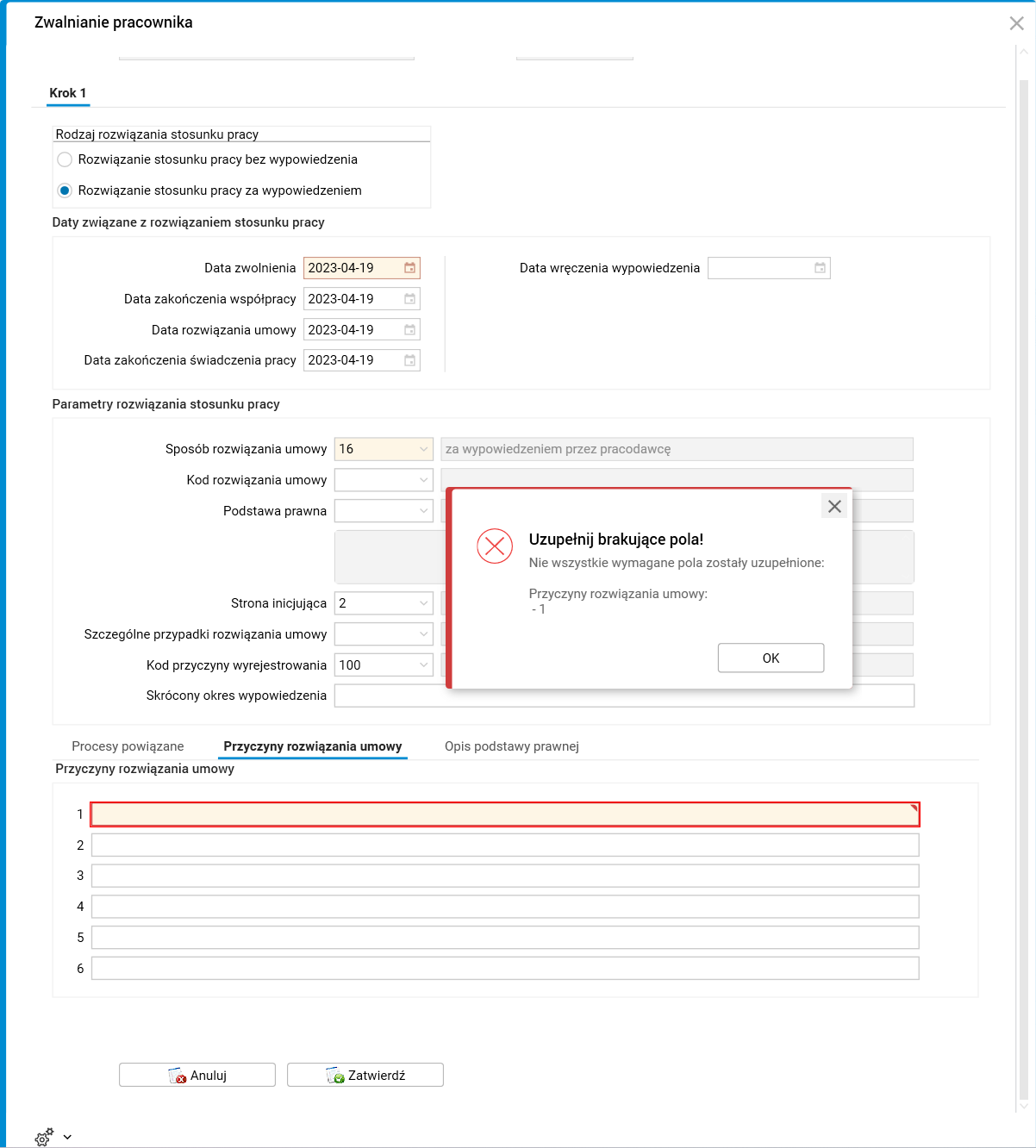 Wówczas, jeżeli będziemy chcieli zwolnić pracownika procedurą Zwalnianie pracownika dostępną w słowniku Pracownicy i wybierzemy sposób rozwiązania umowy, którego inicjatorem jest pracodawca, ale nie wypełnimy pola Przyczyny rozwiązania umowy, zobaczymy komunikat z informacją o konieczności uzupełnienia informacji. Dopóki pole to nie zostanie uzupełnione, nie będzie można zatwierdzić procedury.