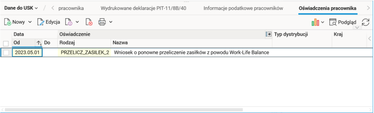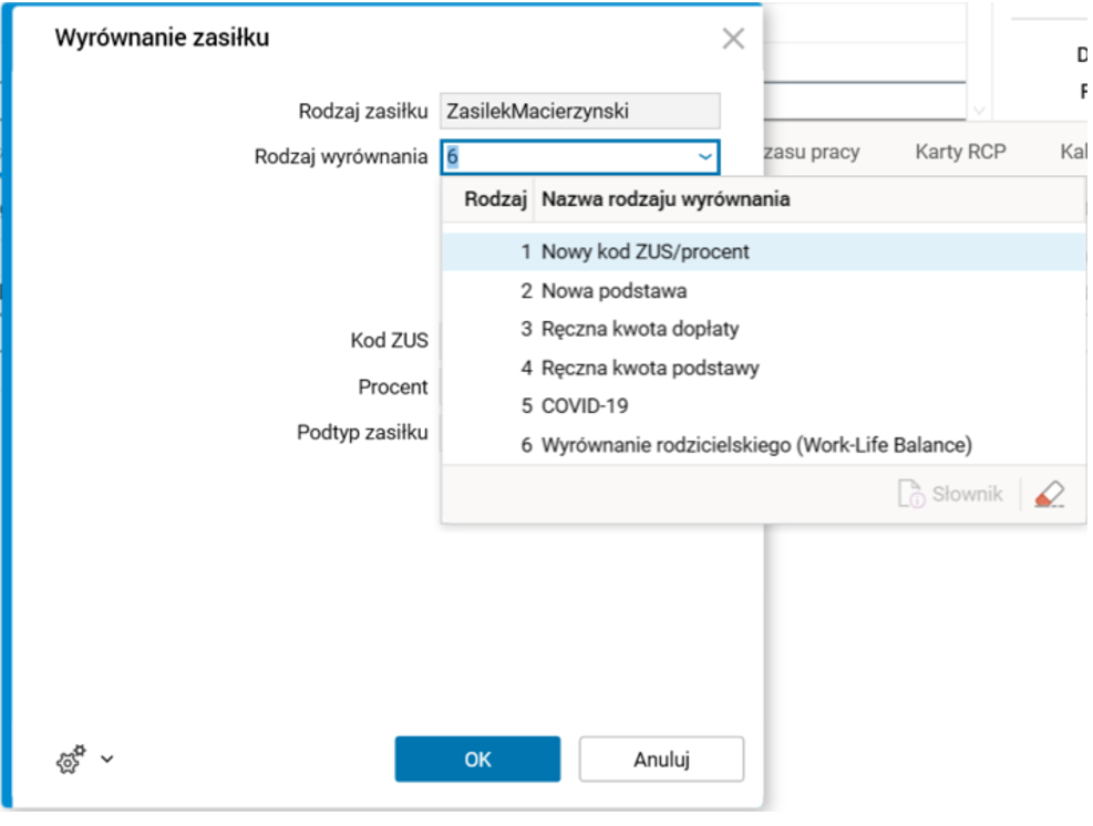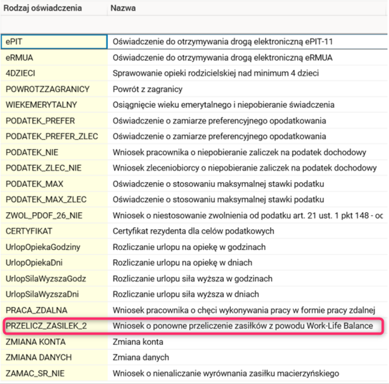 Ponadto dodano nowy rodzaj oświadczenia pracownika / wniosku PRZELICZ_ZASILEK_2, czyli Wniosek o ponowne przeliczenie zasiłków z powodu Work-Life Balance w słowniku Rodzaje oświadczeń.