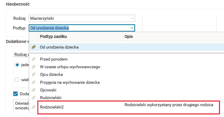 Dodano nowy podtyp zasiłku macierzyńskiego: Rodzicielski2, czyli urlop rodzicielski wykorzystany przez drugiego rodzica.