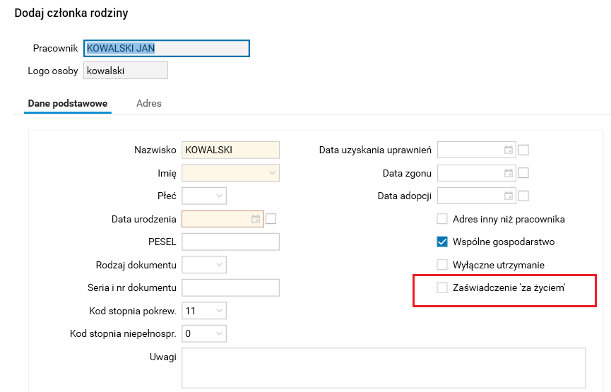 W oknie parametrów procedur Dodaj członka rodziny oraz Zmień dane członka rodziny, dostępnych w szczególe Rodzina w słowniku Pracownicy dodano możliwość rejestracji informacji o posiadaniu przez pracownika – rodzica dziecka, u którego stwierdzono ciężkie i nieodwracalne upośledzenie lub nieuleczalną chorobę zagrażającą życiu, zaświadczenia „za życiem”.