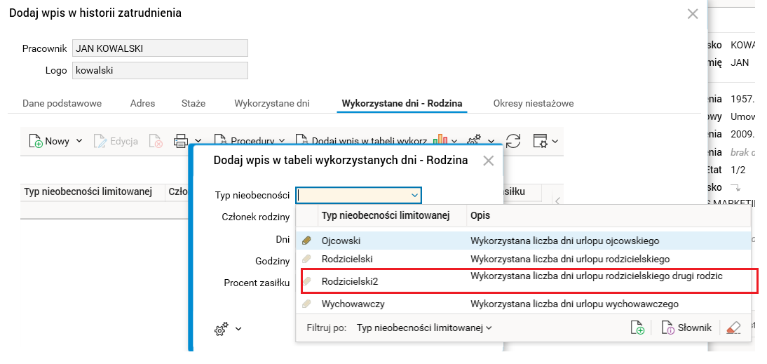 W oknie parametrów procedur Dodaj wpis w historii zatrudnienia oraz Zmień wpis w historii zatrudnienia, dostępnych w szczególe Historia zatrudnienia w słowniku Pracownicy, dodano możliwość wprowadzenia liczby dni urlopu rodzicielskiego wykorzystanego przez drugiego rodzica (typ nieobecności limitowanej Rodzicielski2).