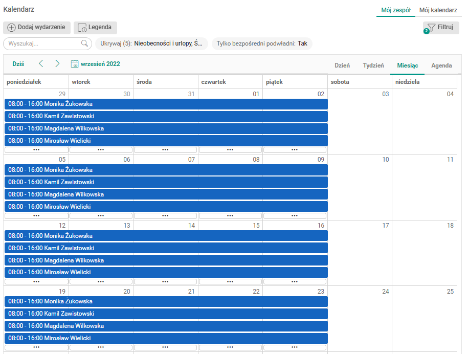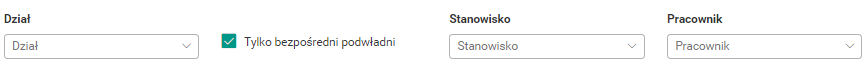 - Tylko bezpośredni podwładni – filtr Zespół;Wszyscy i Zespół;Bezpośrednio podwładni ograniczono tylko do bezpośrednio podwładnych.