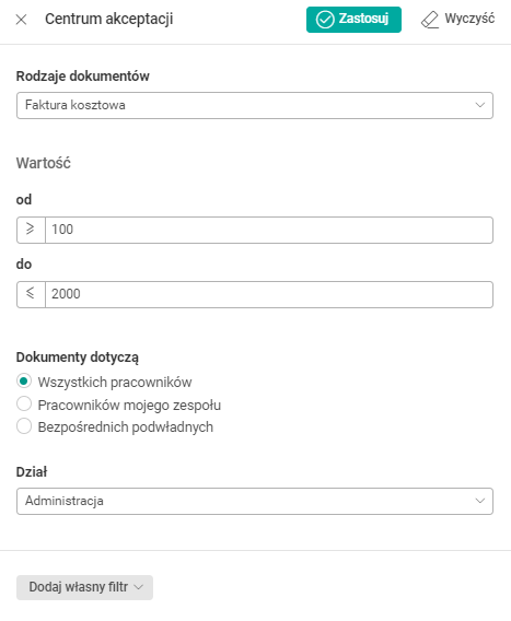 Na pulpicie Centrum akceptacji zmieniono filtr Dokumenty dotyczą: Wszystkich pracowników; Pracowników mojego zespołu; Bezpośrednich podwładnych. Został on utworzony na podstawie wcześniej funkcjonujących filtrów: Zespół;Wszyscy i Zespół;Bezpośrednio podwładni.