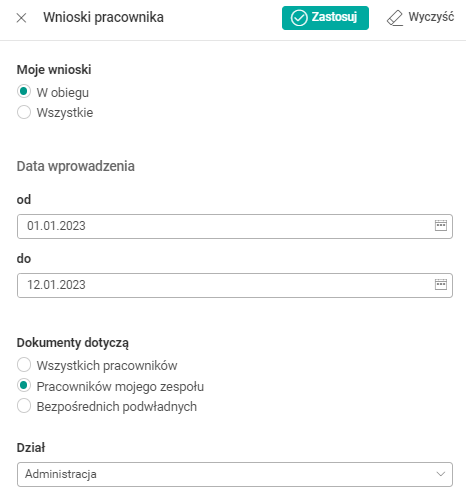 Na pulpicie Wnioski dodany został filtr Dział, domyślnie jest niewypełniony. Zmieniono natomiast filtr Dokumenty dotyczą: Wszystkich pracowników; Pracowników mojego zespołu; Bezpośrednich podwładnych (przebudowa filtrów Zespół;Wszyscy i Zespół;Bezpośrednio podwładni).