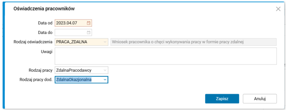 1. Jeżeli w polu Rodzaj pracy wybrano rodzaj pracy zdalnej okazjonalnej, to zakończeniu podlegają tylko rodzaje pracy zdalnej okazjonalnej (obowiązujące na dzień wskazany w polu Data od nowego oświadczenia);