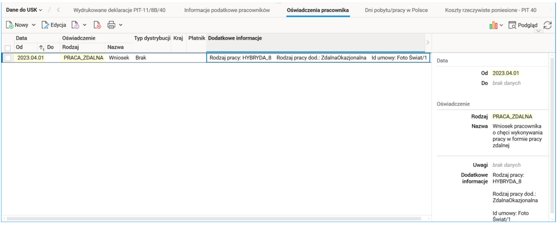 Po zarejestrowaniu nowego oświadczenia o rodzaju PRACA_ZDALNA następuje: