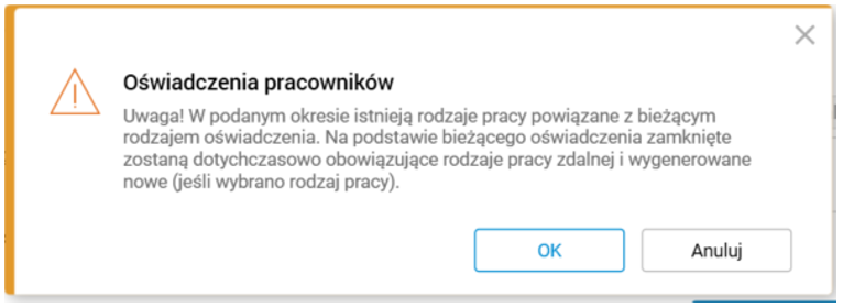 2. Jeżeli w polu Rodzaj pracy wybrano rodzaj pracy innej niż praca zdalna okazjonalna, to zakończeniu podlegają wszystkie rodzaje pracy zdalnej pracownika (obowiązujące na datę od nowego oświadczenia).