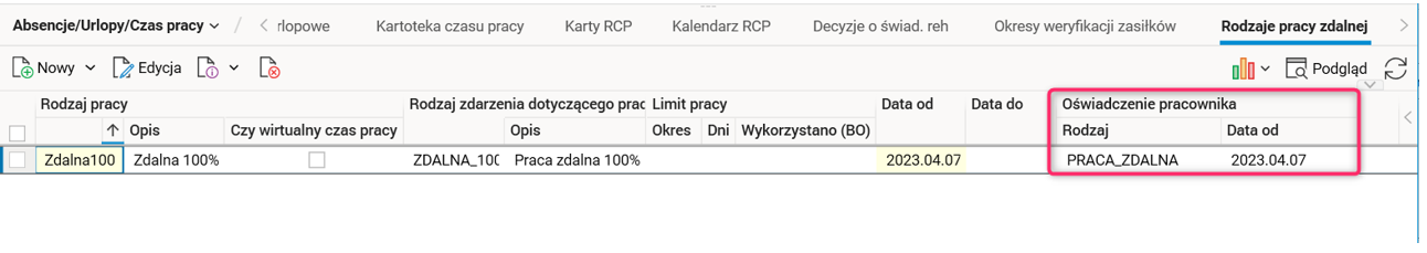 W słowniku Rodzaje pracy zdalnej dodano grupę kolumn Oświadczenie pracownika, która pokazuje rodzaj oświadczenia, na podstawie którego powstał rodzaj pracy.