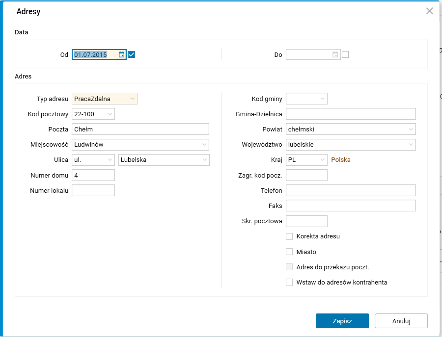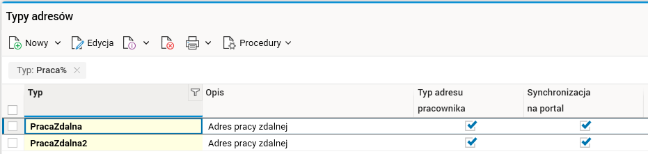 Rejestrację pracy zdalnej w systemie należy rozpocząć od wprowadzenia zaakceptowanych przez pracodawcę adresów miejsc, w których pracownik będzie świadczył pracę w trybie zdalnym. Do tego celu utworzono dwa nowe typy adresów: PracaZdalna i PracaZdalna2, czyli główny i dodatkowy adres świadczenia pracy w trybie zdalnym.