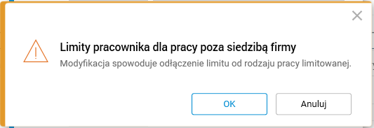 W przypadku, gdy użytkownik chce zmienić zarejestrowany limit pracy zdalnej, przed modyfikacją zobaczy komunikat.