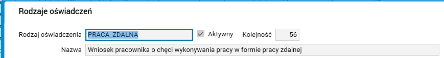 Po wprowadzeniu adresów należy wprowadzić takie oświadczenie. Służy do tego nowy rodzaj oświadczenia: PRACA_ZDALNA (Wniosek pracownika o chęci wykonywania pracy w formie zdalnej).