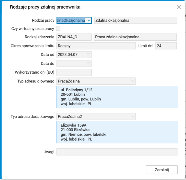 w oknie edycyjnym dostępne będzie dodatkowe pole Rodzaj pracy dod., domyślnie wypełnione wartością ZdalnaOkazjonalna.