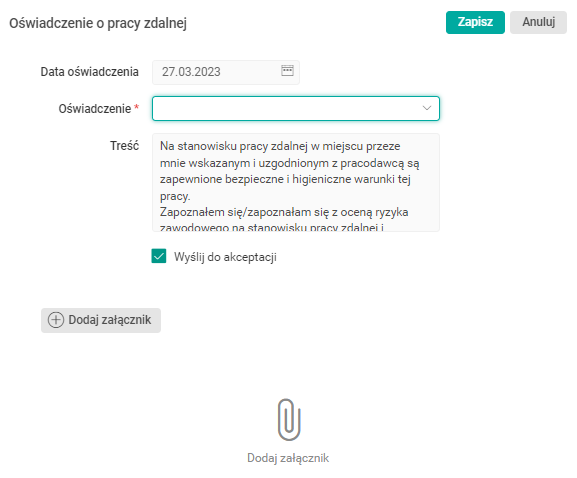 - Akceptuję powyższe oświadczenie – w celu złożenia oświadczenia o pracy zdalnej wymagane jest zaakceptowanie oświadczenia dotyczącego warunków świadczenia tej pracy.