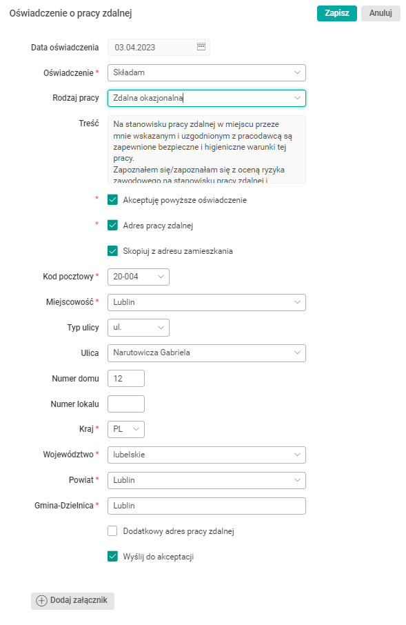 - Dodatkowy adres pracy zdalnej – po zaznaczeniu pola pojawi się możliwość dodania kolejnego pola adresowego, przeznaczonego do wprowadzenia adresu dodatkowego miejsca świadczenia pracy zdalnej.