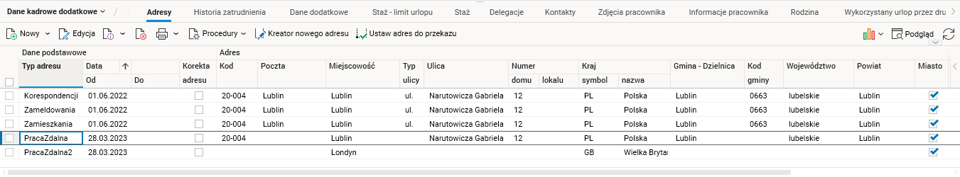 - w słowniku Pracownicy, w szczególe Adresy powstaje wpis z adresem o typie PracaZdalna, a jeżeli pracownik w oświadczeniu wskazał dodatkowy adres pracy zdalnej – również PracaZdalna2.