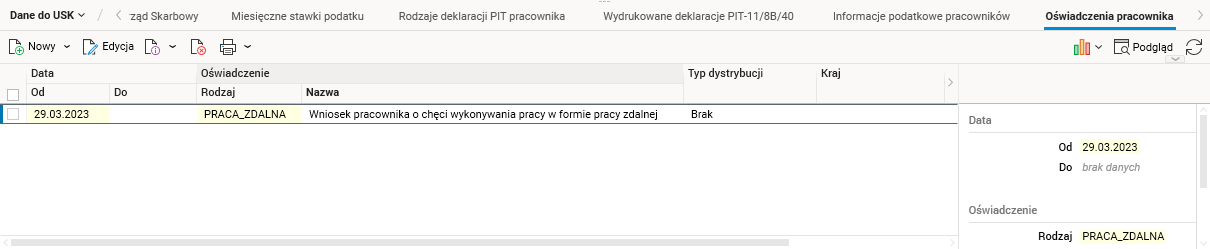 - w słowniku Pracownicy, w szczególe Oświadczenia pracownika powstaje wpis o rodzaju PRACA_ZDALNA, gdzie Data;Od uzupełniana jest automatycznie datą złożenia oświadczenia.