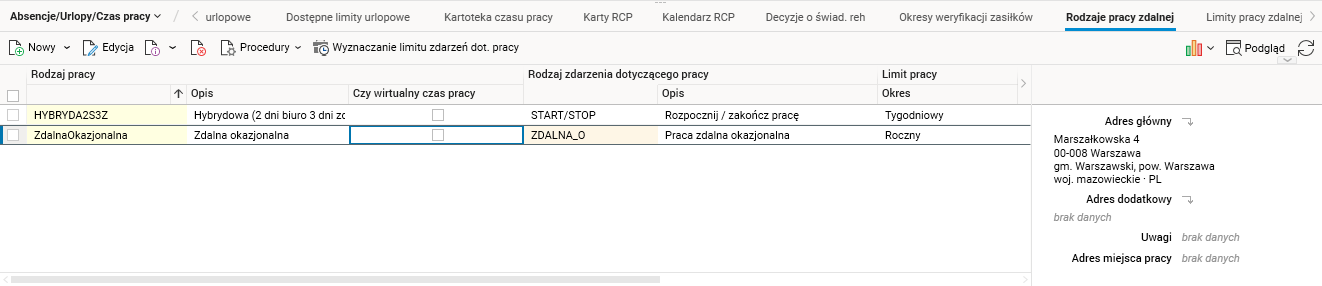 - w słowniku Pracownicy, w szczegółach Rodzaje pracy zdalnej i Limity pracy zdalnej generują się wpisy dotyczące rodzaju pracy zdalnej oraz jej limitów.