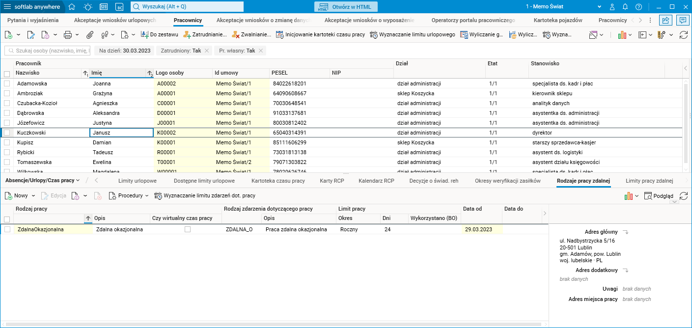 - W panelu bocznym szczegółu znajduje się dodatkowa sekcja zawierająca zadeklarowane przez pracownika adresy miejsca wykonywania pracy – Adres główny oraz Adres dodatkowy i ewentualne Uwagi.