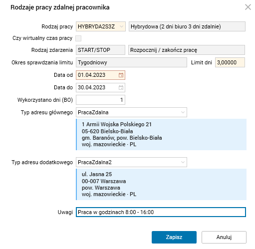 Rys. Okno edycyjne w szczególe Rodzaje pracy zdalnej