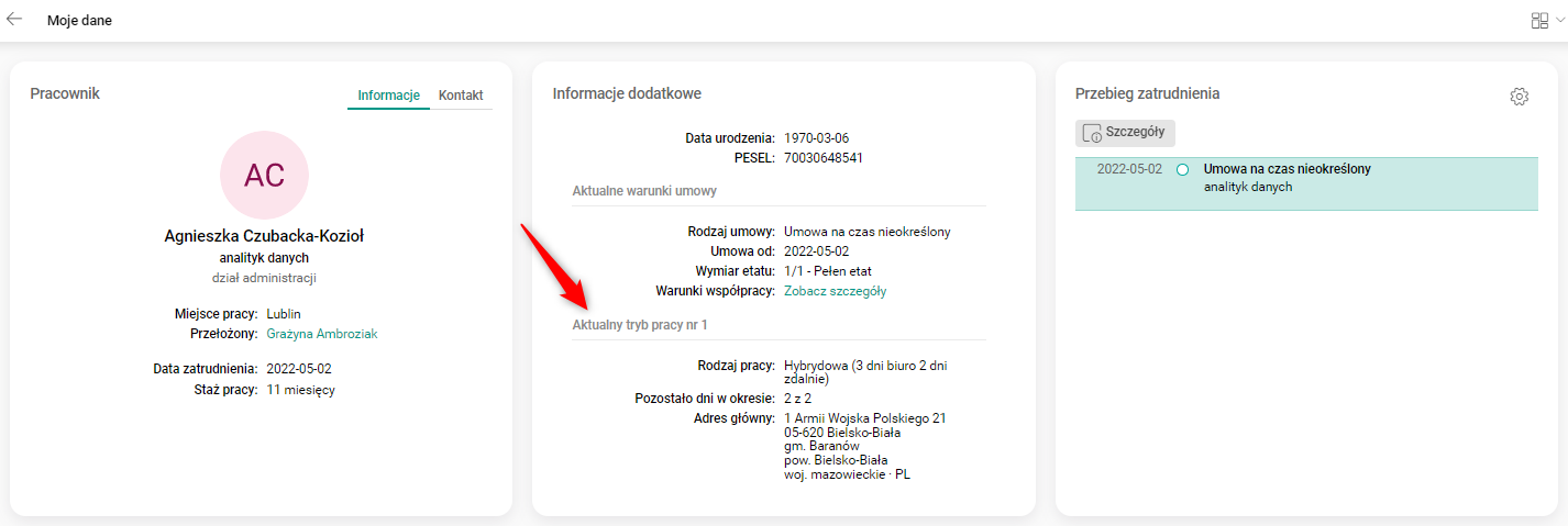 Rodzaj pracy, adres miejsca pracy i ewentualne uwagi są widoczne w portalu HR na pulpicie Moje dane, w sekcji Informacje dodatkowe. Nowy akapit z dodatkowymi danymi pracownika nosi nazwę Aktualny tryb pracy.
