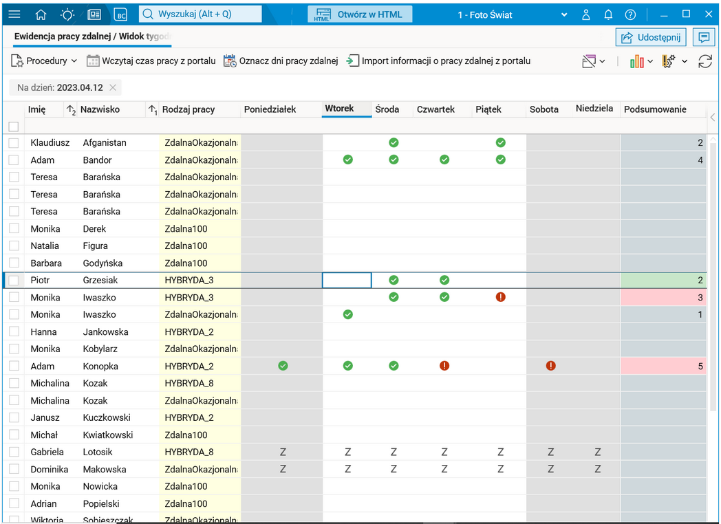 Ewidencja pracy zdalnej, przekrój Widok tygodniowy