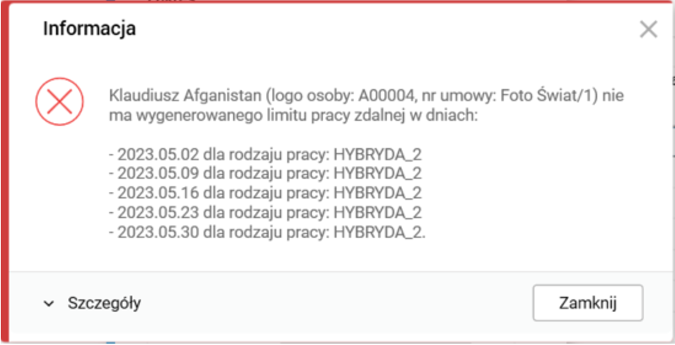 Komunikat o braku wygenerowanych limitów pracy zdalnej dla wybranego rodzaju pracy zdalnej