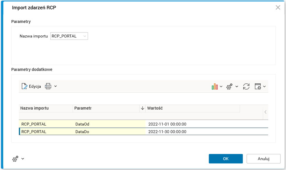 Parametry procedury Import zdarzeń RCP