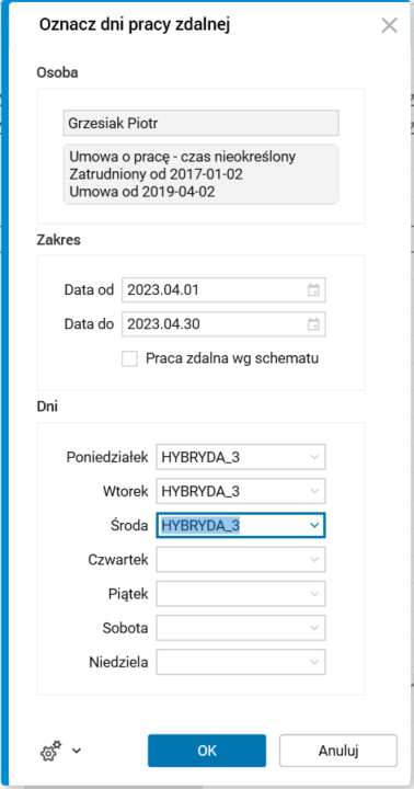 - Praca zdalna wg schematu to opcja, która umożliwia wygenerowanie danych w podanym okresie na podstawie schematu pracy zdalnej przypisanego dla danego pracownika.