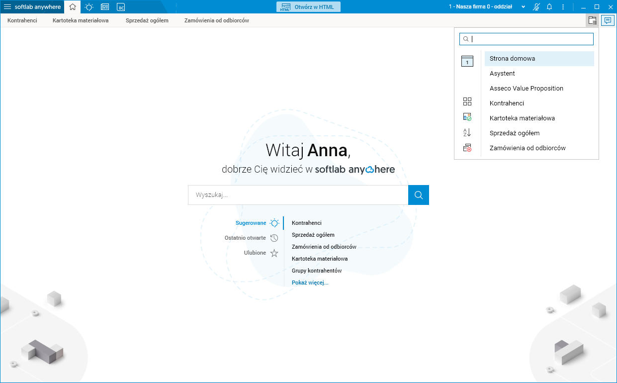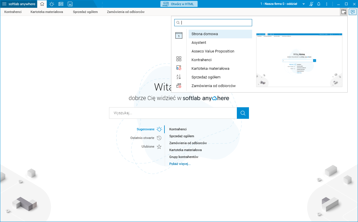 Wyszukiwarka znajduje się na górze okna i staje się aktywna po wpisaniu 3 lub więcej znaków, wyświetlając listę zakładek, dla których podana fraza zawiera się w części ich nazwy (np. wpisując ntr wyszukiwarka podpowie słownik Kontrahenci).