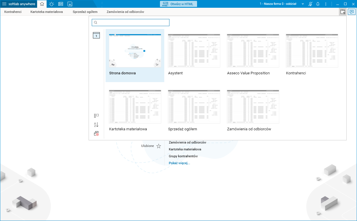 Widok podstawowy okna Otwarte zakładki przedstawia listę otwartych zakładek, po której możemy nawigować.