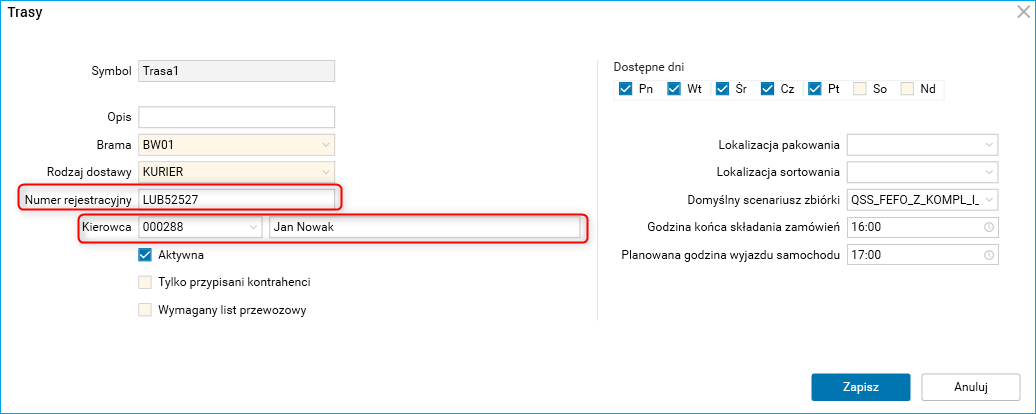 Rys. Pola Numer rejestracyjny i kierowca w oknie edycyjnym trasy